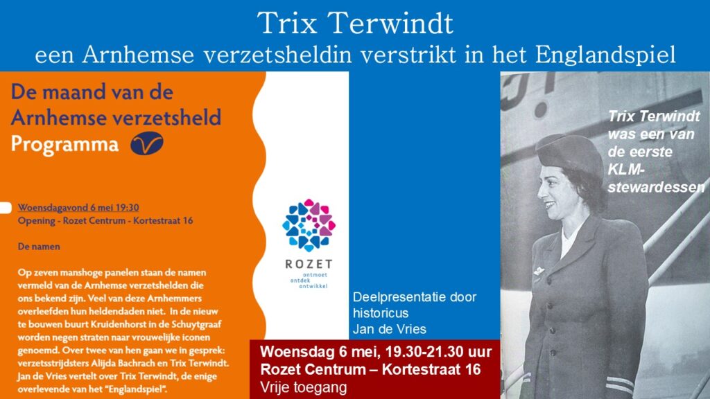 Op woensdag 6 mei is in Rozet de opening van ‘De maand van de Arnhemse verzetsheld’. Op deze avond vertelt historicus Jan de Vries het bijzondere levensverhaal van de Arnhemse verzetsheldin Trix Terwindt. Als één van de eerste KLM-stewardessen werd ze gevraagd om voor Engeland in het bezette Nederland spionage- en ontsnappingsroutes op touw te zetten. Ze raakte daarbij verstrikt in het dubbelspionagecomplot van het Englandspiel. Ze werd gevangen genomen en belandde in verschillende concentratiekampen. Ze overleefde de ontberingen en verschrikkingen, maar daarmee was haar strijd nog niet voorbij.