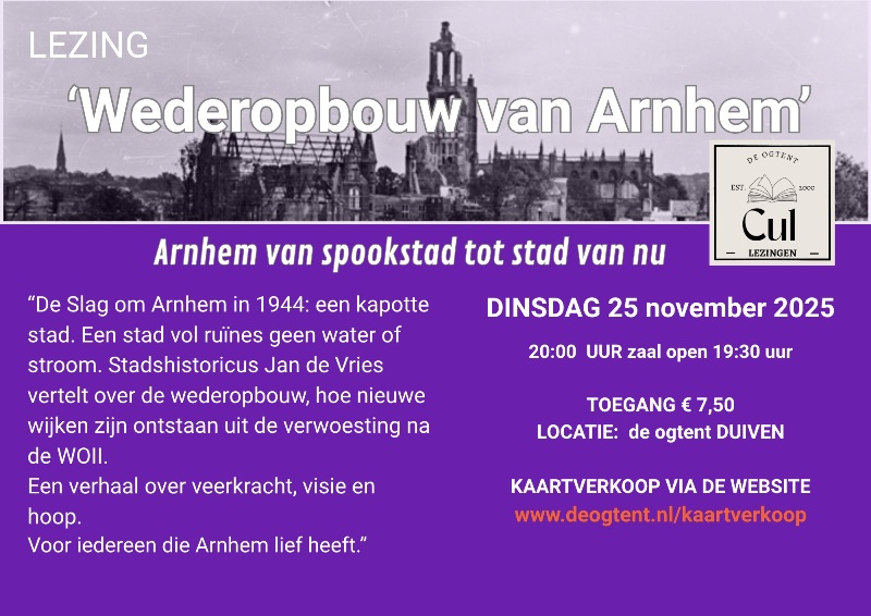 Online kaartverkoop en meer informatie: https://deogtent.nl/product/cul-lezing-de-wederopbouw-van-arnhem-na-1945-door-jan-de-vries/